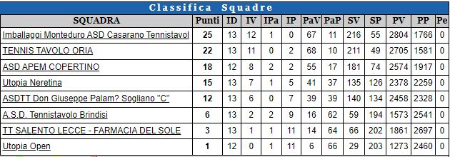 Sabato prossimo termina il campionato con la sfida casalinga proprio contro la seconda in classifica: il Tennis Tavolo Oria, peraltro già battuto nel girone di andata per 4-2. Un’eventuale sconfitta sarebbe comunque indolore, visti i tre punti di distacco in classifica.
